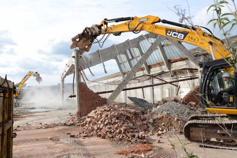 The buildings included a re-enforced concrete portal frame and a large office block, all sections of the building had to be pulverised, separating the heavy rebar from the concrete. All rubble was then crushed.